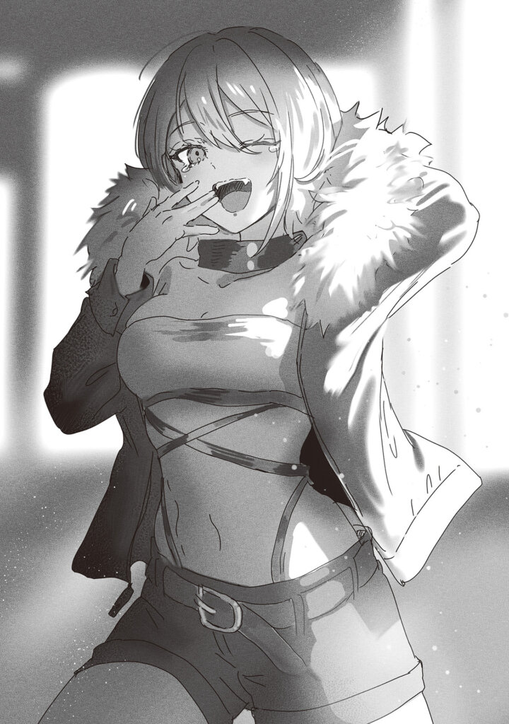 I don’t think Nap Lover-san is a bad person… Her appearance gives off the vibe of a languid older sister. She has large gauntlets equipped on both hands, and her avatar wears a mature leather jacket and hot pants, striking an exquisite balance between sexy and cute. Her hair is short and brown, and her eyes are gold. Wow, she has a Real Module avatar just like me! I feel a little bit of affinity with her now.
