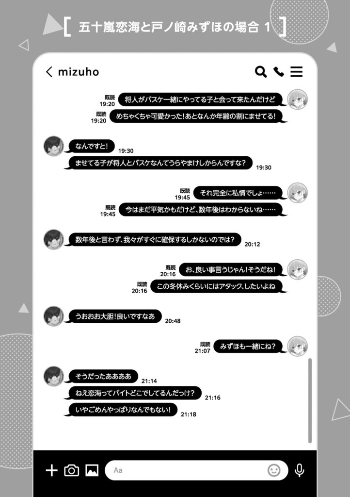 Next to me, Koumi-san was wiping sweat with a towel. Because she was definitely better than the kids in my grade, I was able to play basketball with all my might too. With Masato-san, I inevitably end up in the position of being instructed, so being able to challenge someone one-on-one with full force was something I was very grateful for.